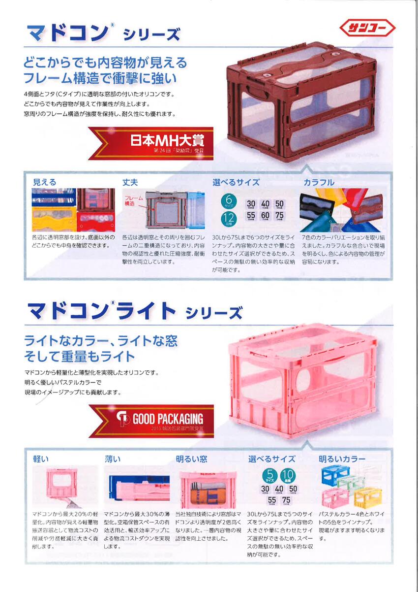 ◇ 底面以外の各面に透明窓を一体成形したオリコンです。透明窓を各面に一体成形する“二材質一体成形”技術を用いて成形。中身の視認性と優れた圧縮強度、耐衝撃性を両立しています。