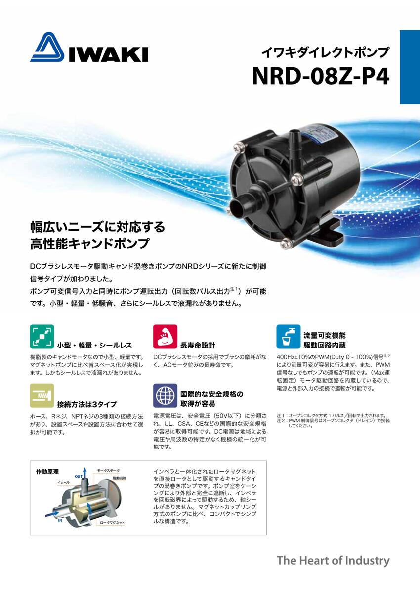 ◇ NRDシリーズはインペラと一体化されたロータマグネットを直接ロータとして駆動するキャンドタイプの渦巻きポンプです。樹脂製のキャンドモータなので小型、軽量です。マグネットポンプに比べ省スペース化が実現します。しかもシールレスで液洩れがありません。