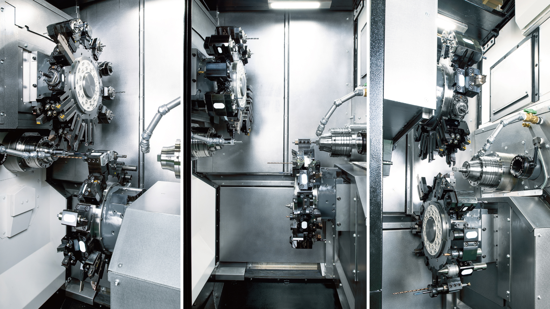 ◇ コンパクトながら、24ステーションのタレットを上下に1つずつ搭載。クアドラプルホルダを使うことで、最大72本の工具をセットすることができます。 旋削もミーリングもギヤも、すべての加工はこの1台で完結します。