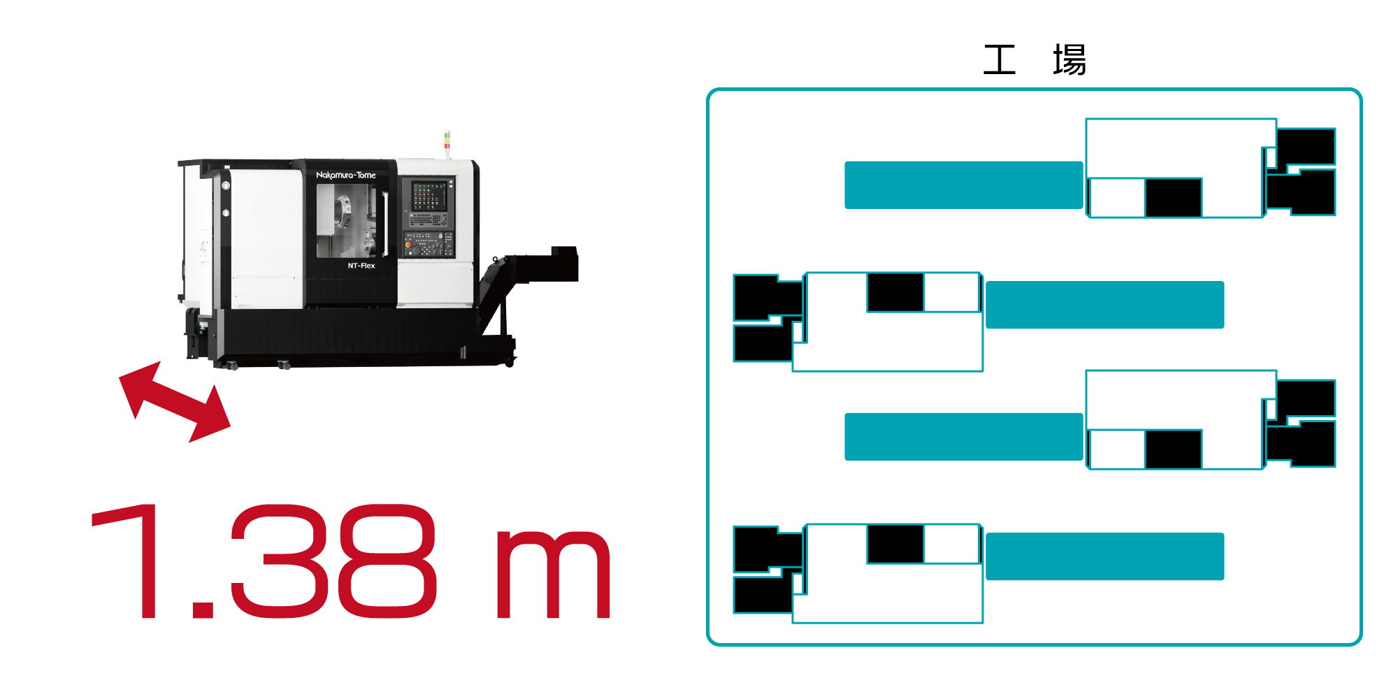 ◇ 機械本体の奥行がたったの1.38m! 工場の限られたスペースに、無駄なく、隙間なく機械を配置することができます。