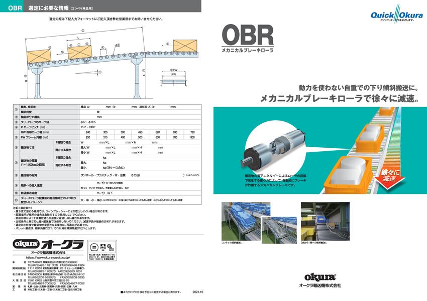 ◇ メカニカルブレーキローラ(OBR)を組み込んだ、ブレーキローラ付コンベヤを販売開始しました。ローラ径φ57(OBRS)とφ60.5(OBRM)の2タイプをラインナップ。