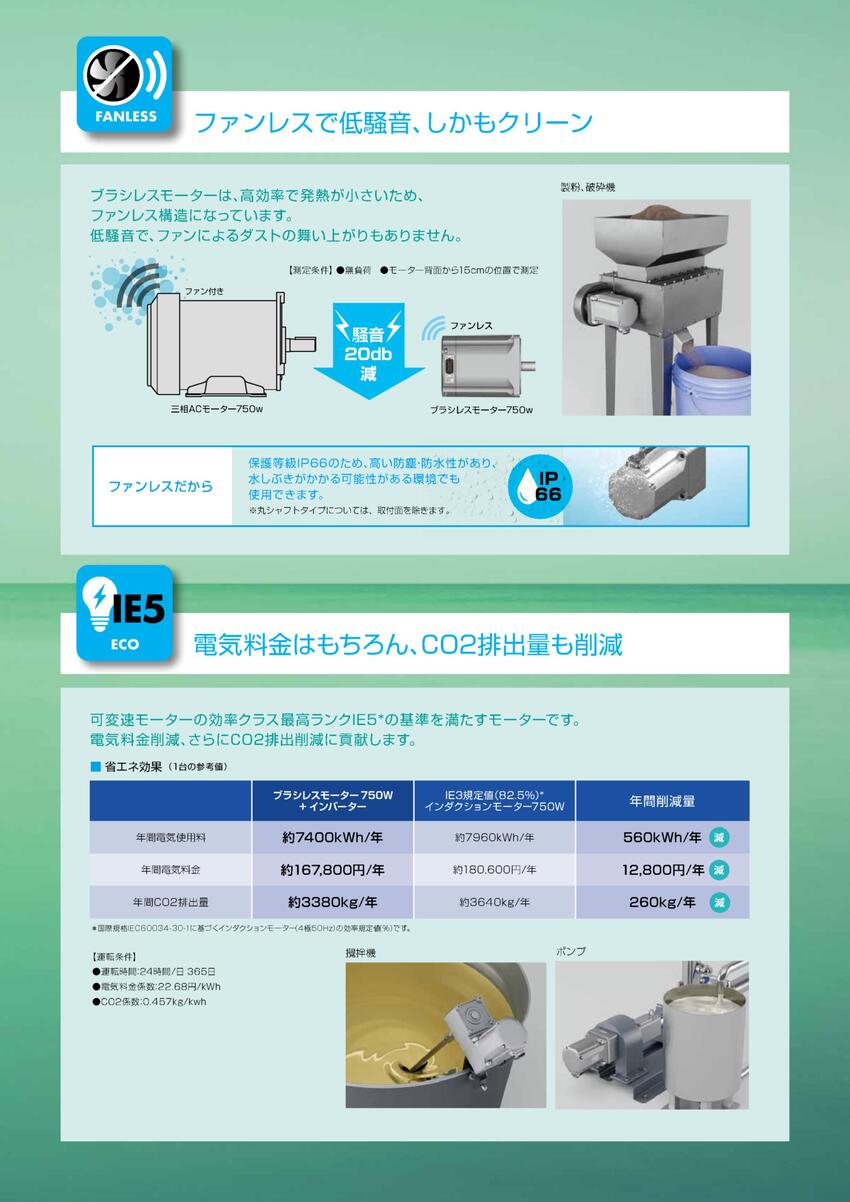 ◇ 三相ACモーターと比較して高効率で発熱が少なく、ファンレス構造を実現。小型・軽量となっており、組み立て作業者の負担を軽減します。さらに、効率レベルはIE5を達成し、電気料金とCO2排出量の削減に貢献します。