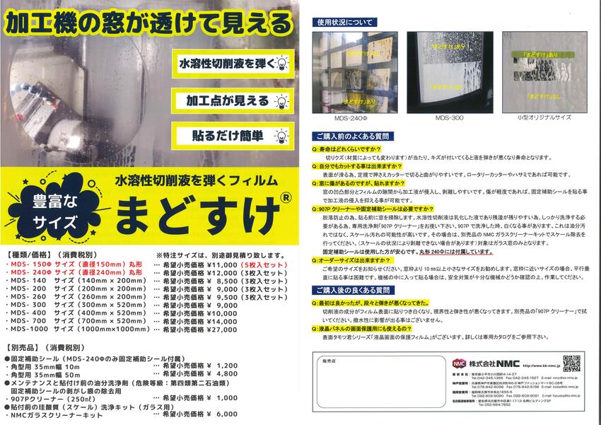 ◇ 水溶性切削液を弾くフィルムです。飛び散ってきたエマルジョン切削液を瞬時に弾き加工状況が確認できます。