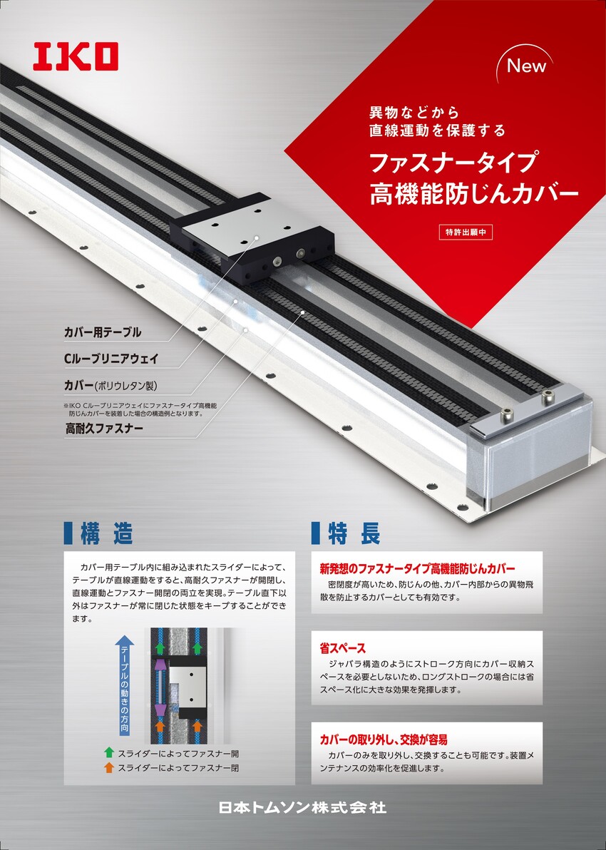◇ ファスナータイプ高機能防じんカバーは、異物などから直線運動を保護する新発想の保護カバーです。 高耐久ファスナーがテーブルの動きに合わせて開閉することによりカバー内の機構を異物などから保護。 密閉度が高いため、防じんの他、カバー内部からの異物飛散を防止するカバーとしても有効です。