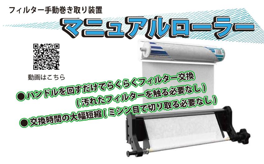 ◇ マニュアルローラーⅡは制御盤やコンプレッサーに取り付けられたマシンツールフィルターWを手動で巻き取りする装置です。