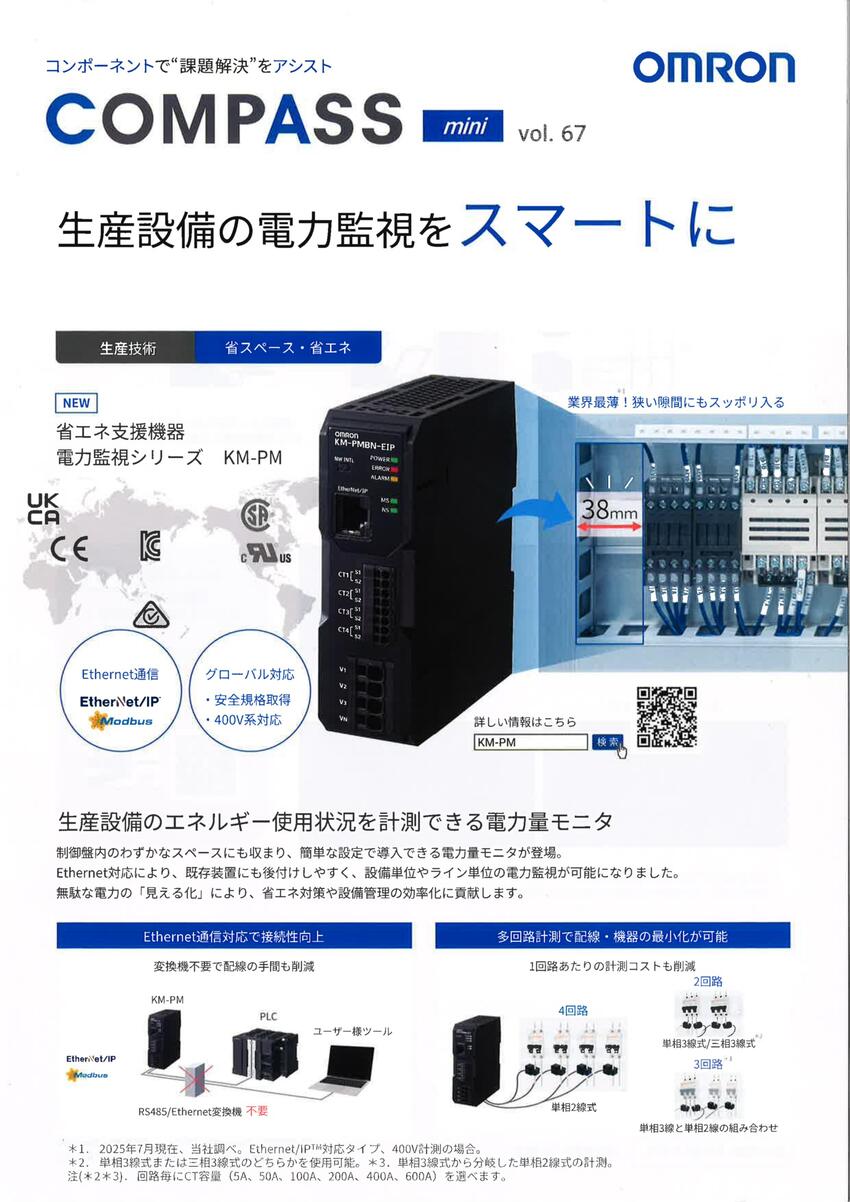 ◇ 幅38mmでグローバルの制御盤内向け Ethernet通信対応電力量モニタ。KM-PMは、制御盤や分電盤の盤内へ取り付けでき、システム構築が容易です。
